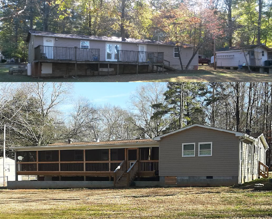 Old rear of house with sad, weird deck that was falling to pieces due to improper construction and poor maintenance.  New covered, screened in deck, retaining wall and the addition which was really adding on a bedroom to a closet because the tiny room was the size of one.